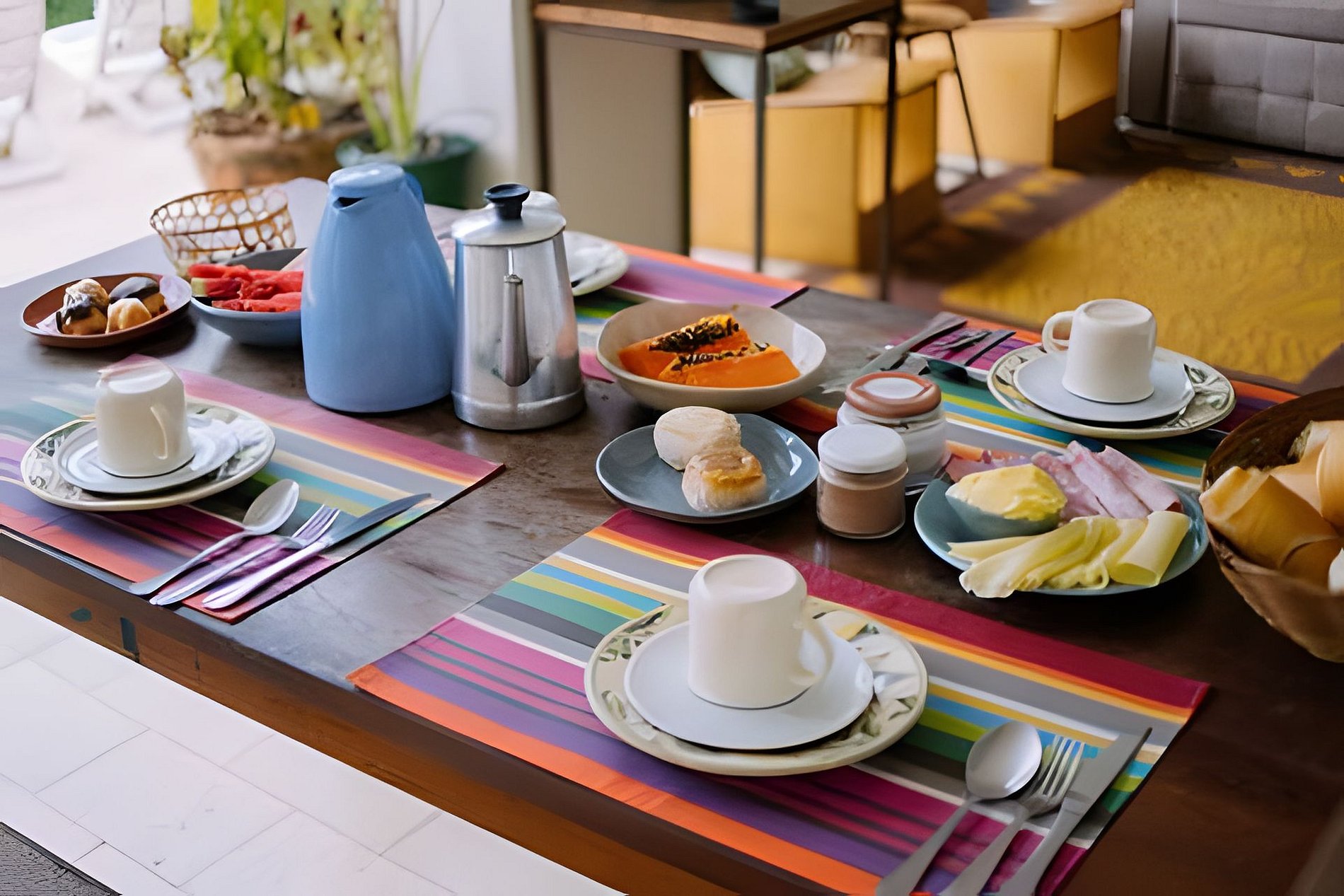 Os hóspedes do airbnb já tem o serviço de café da manhã incluso no valor da diária. Para os hóspedes de outras plataformas é possível optar pelo serviço ou não. Caso desejem contratar a parte, o custo é de R$35/pessoa e precisa ser avisado no dia anterior. O café da manhã é um combo bem completo com pães, frios, manteiga, bolo, fruta, café, leite, achocolatado, e é servido na mesa.