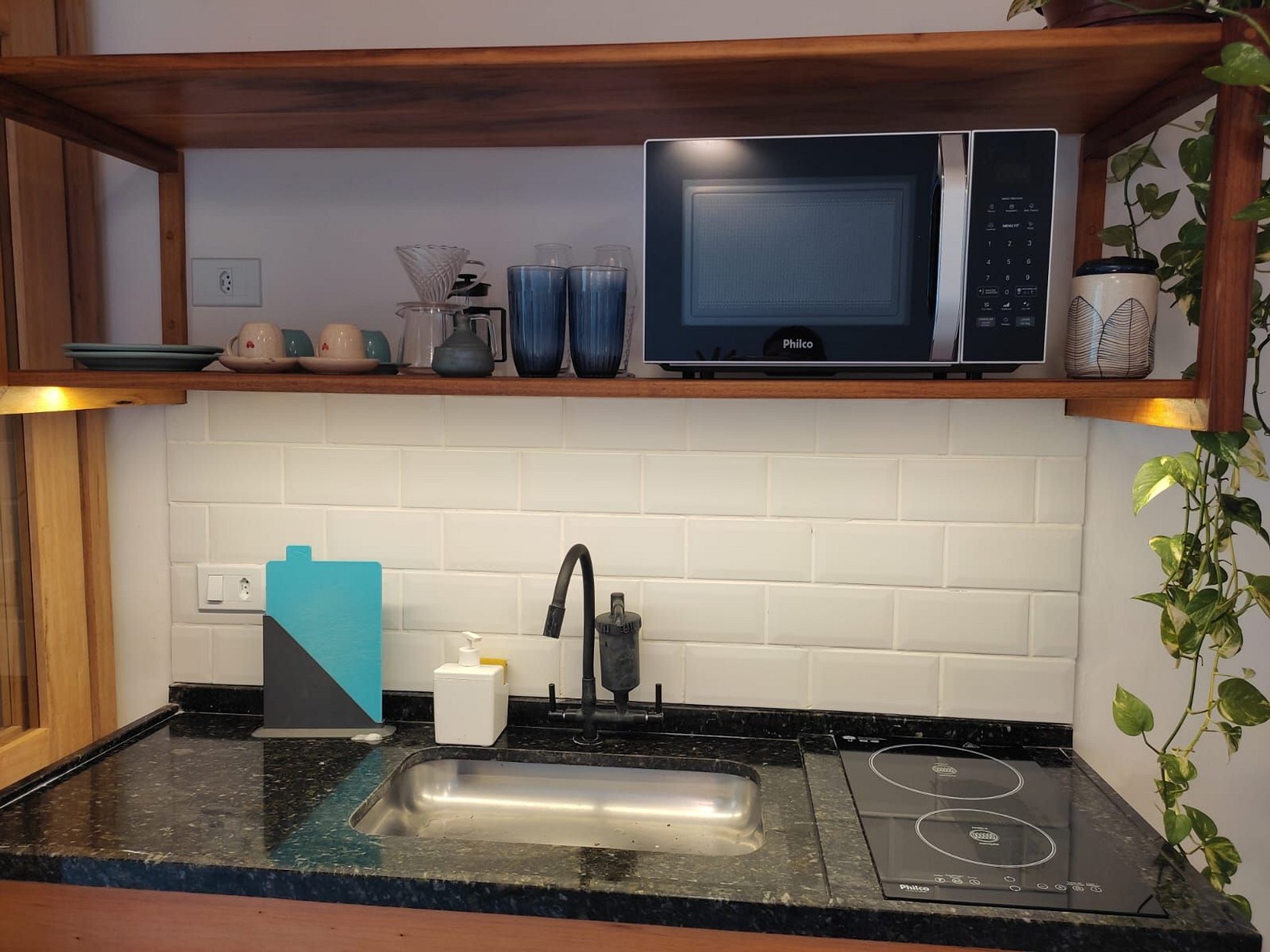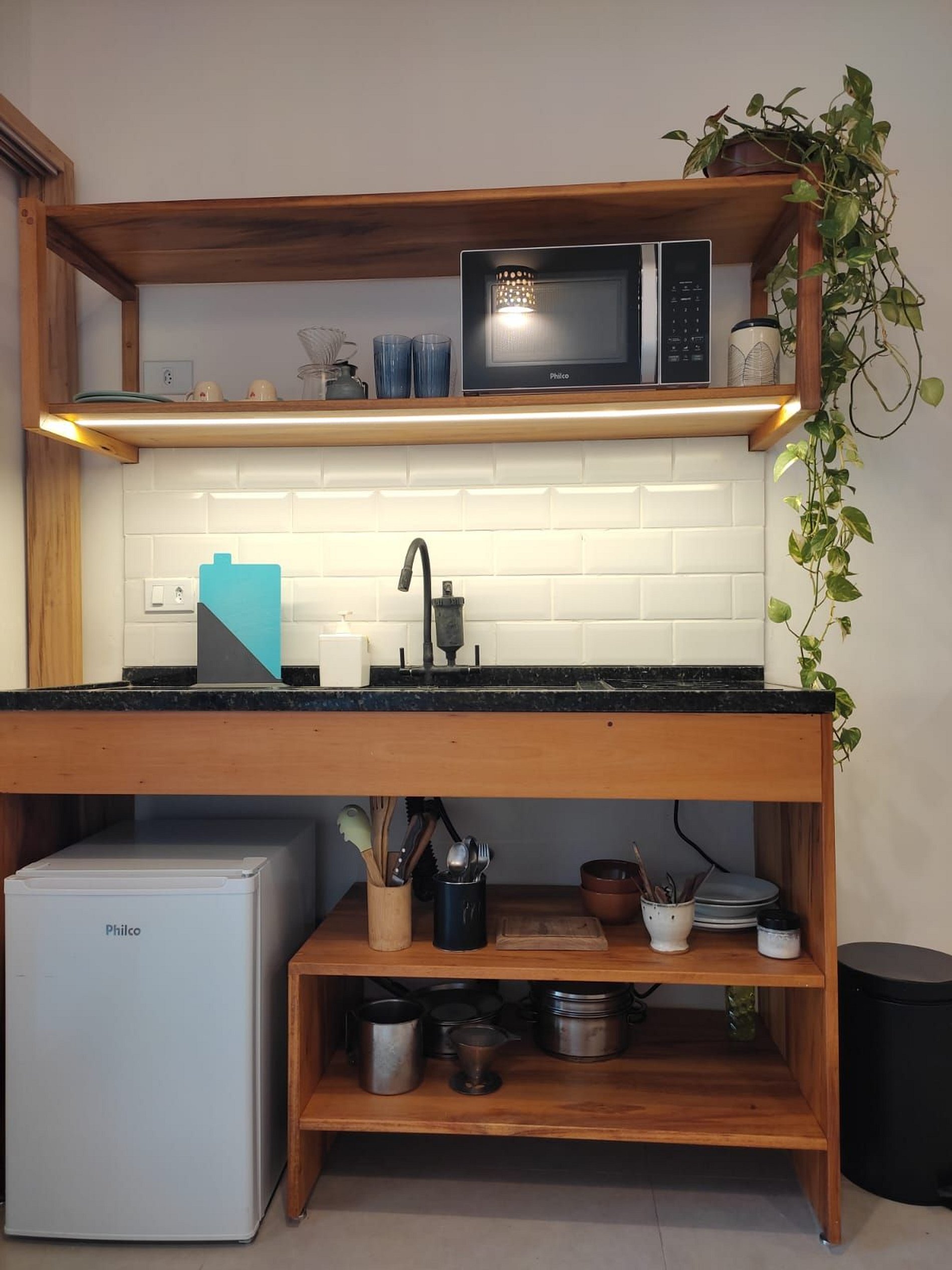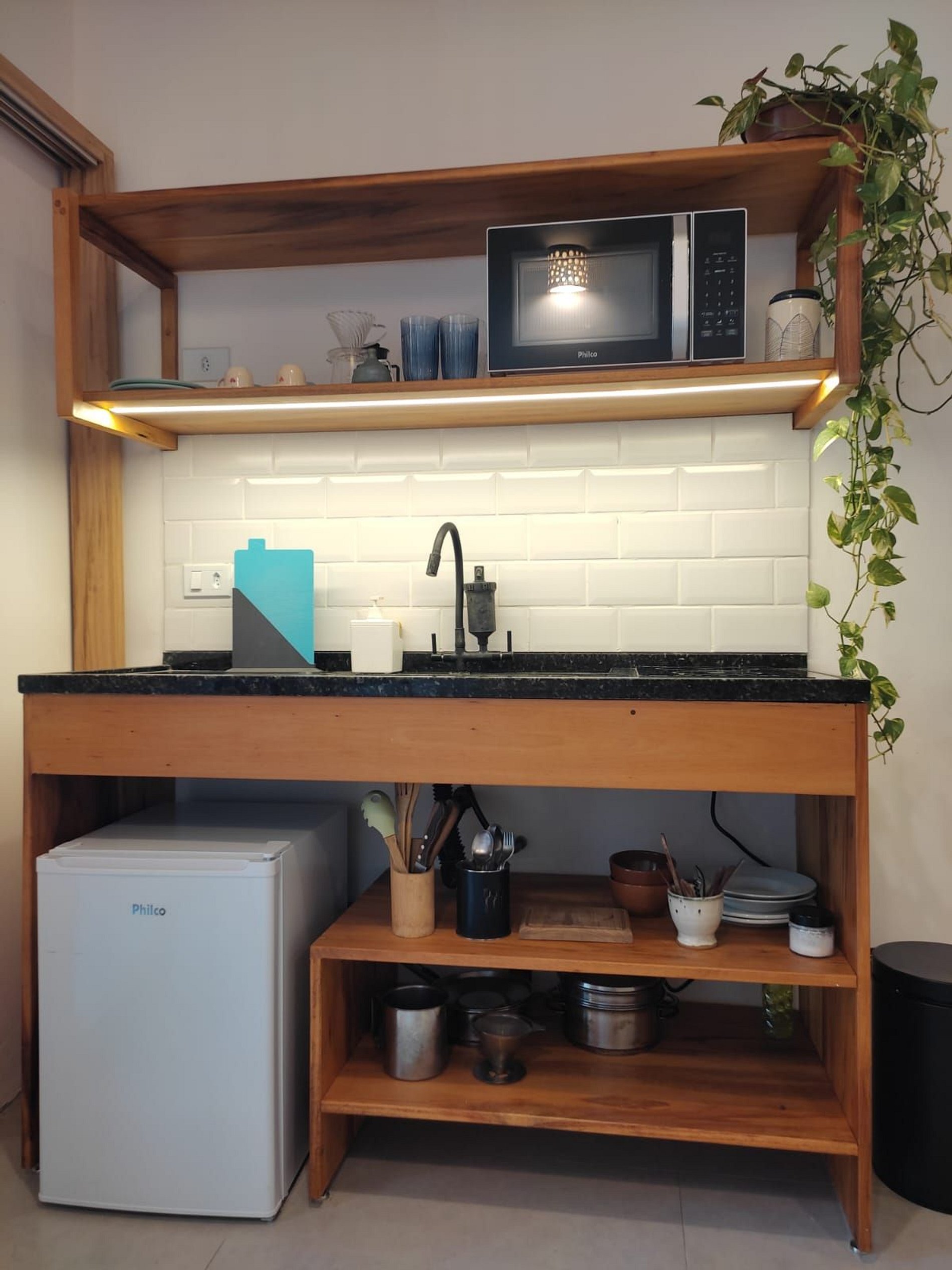 É permitido utilizar a cozinha para preoparo de refeições simples. É bem equipada com fogão, geladeira, microondas e utensilios.